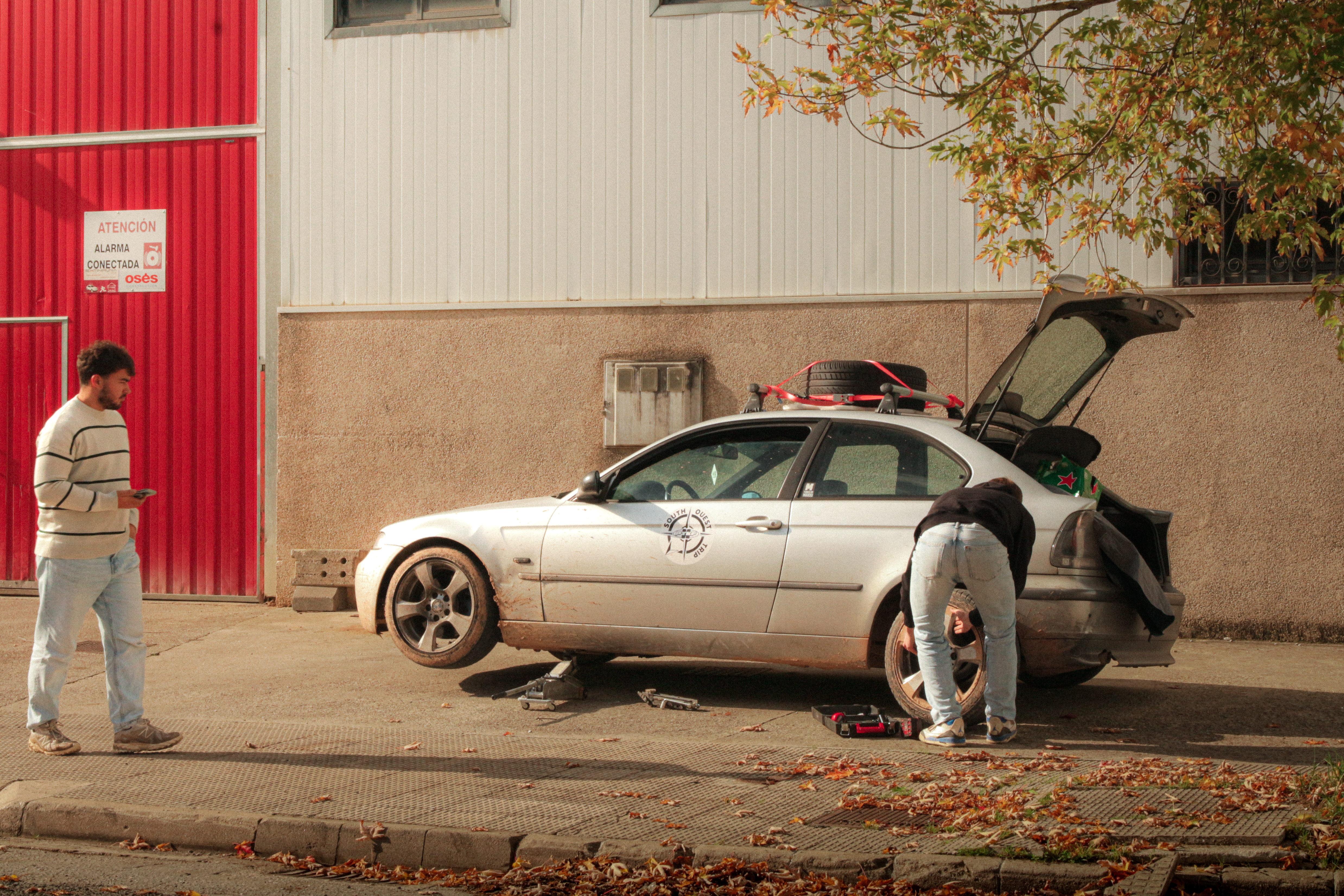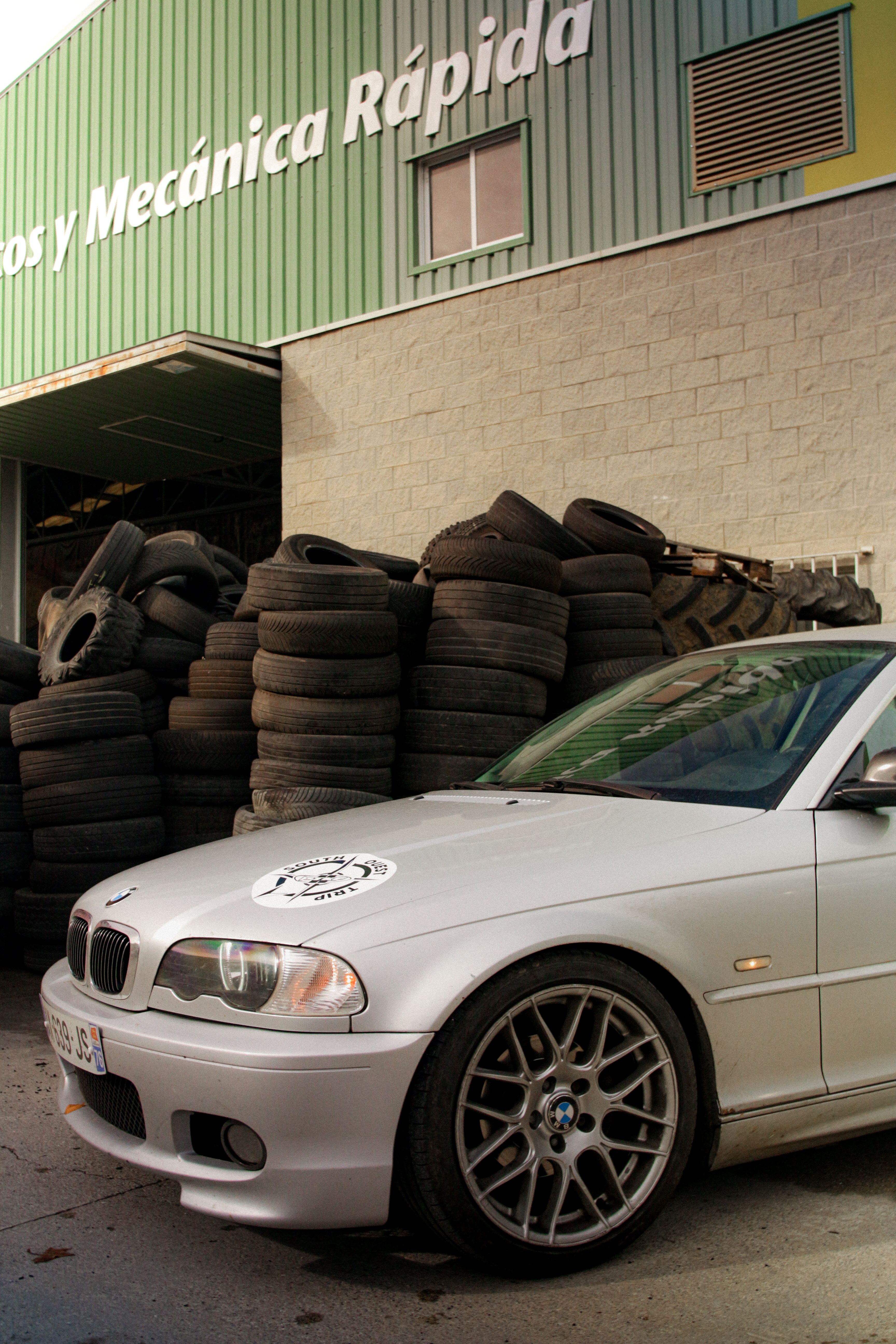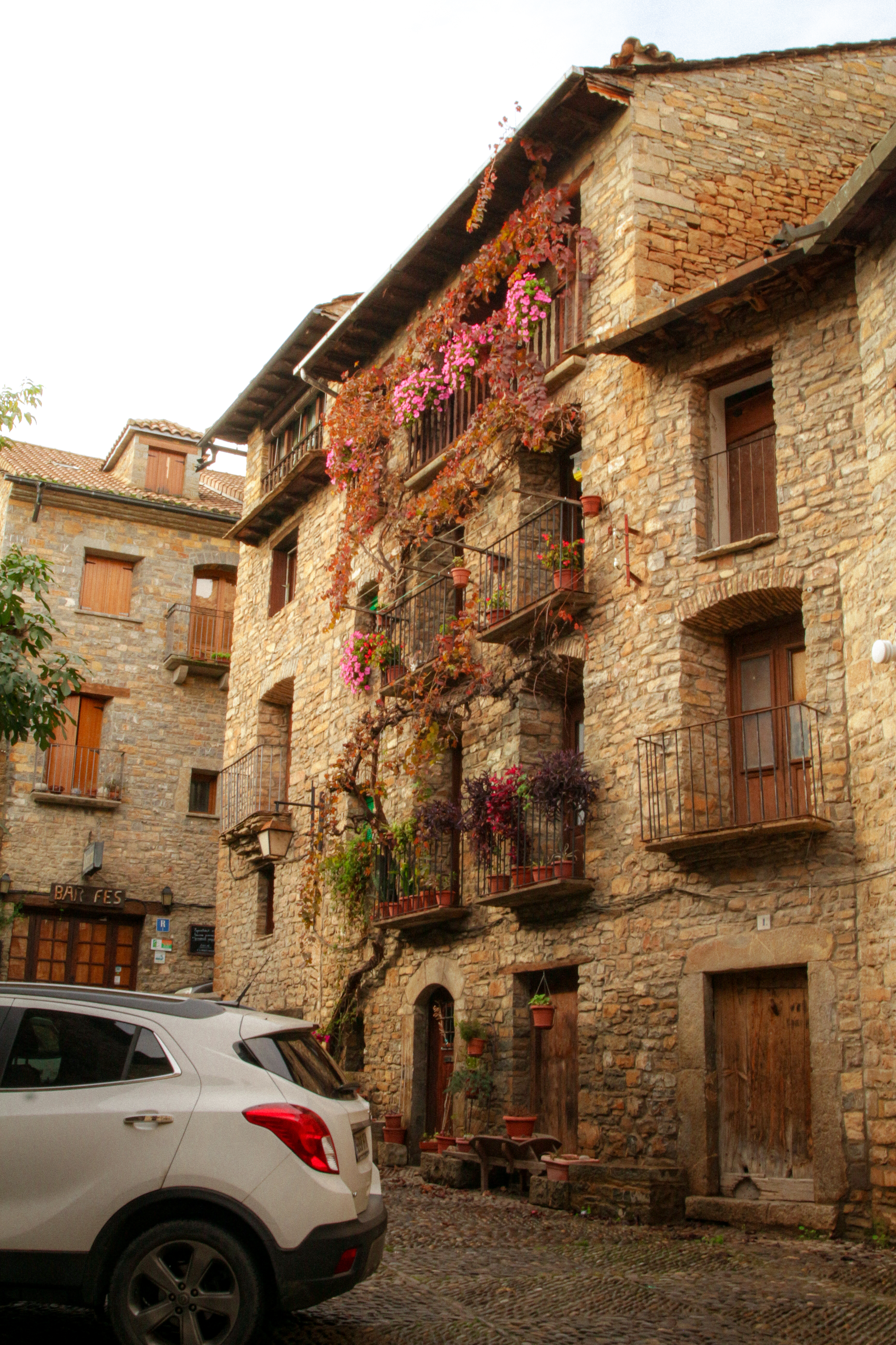 Arriving in Ainsa, we come across an entire car-related commercial area: technical inspection, car wash, garage, body shop, tire shop, 4×4 specialist… you name it. Of course, no one has any 255 wides in stock. The spare will do, though—it’s already seen quite a few miles.