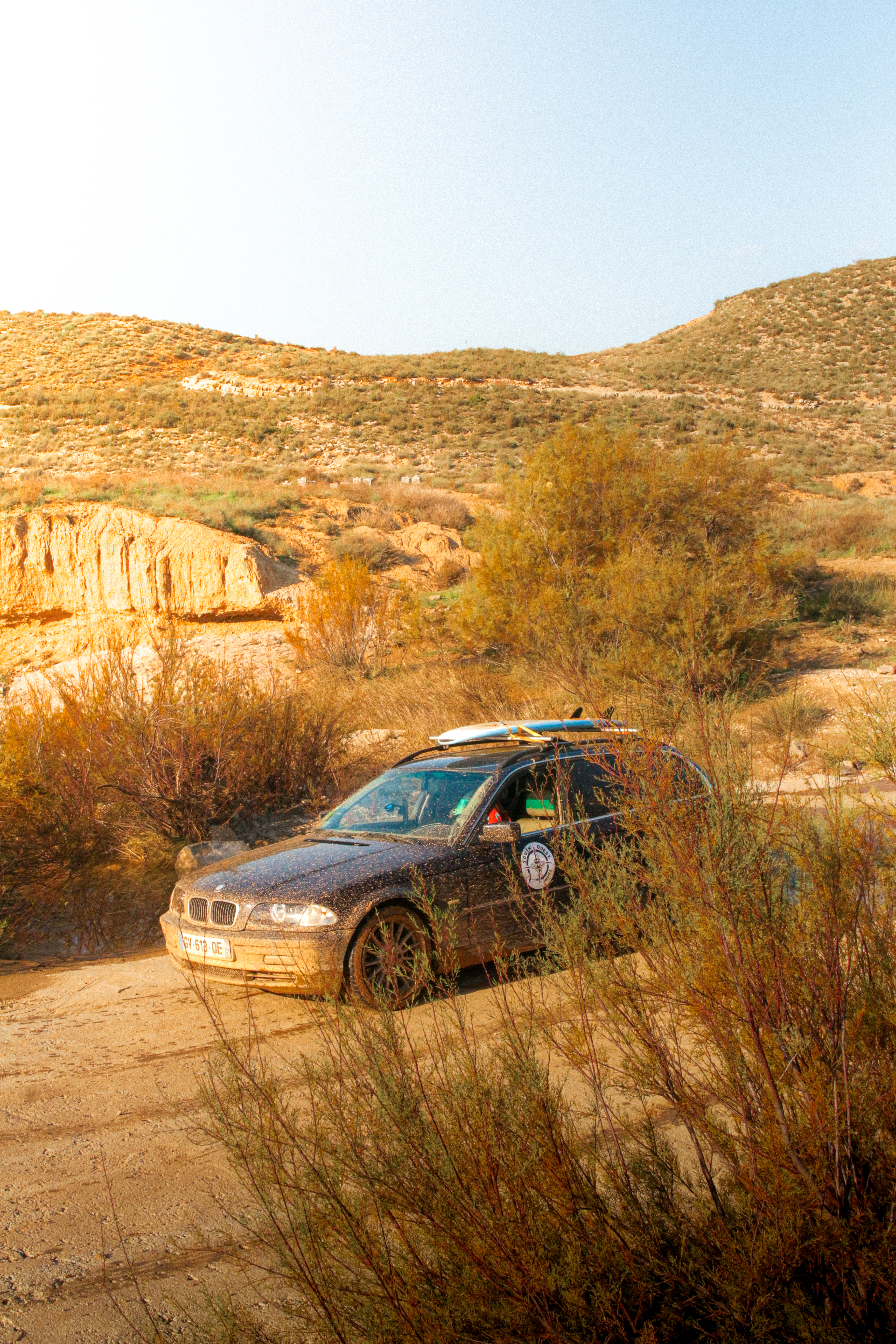 We clocked quite some miles yesterday and are closing in on the Bardenas, so we take our time to enjoy the view. But just as we’re pouring coffee, a Navara with Gobierno de Aragón written on the doors pulls up next to us. It doesn’t take long for us to realize we’re not supposed to be camping here. We manage to dodge the fine and quickly pack up, under the amused looks of the rangers, as we head down the off-road track in our lowered BMWs. Off we go, toward the desert.