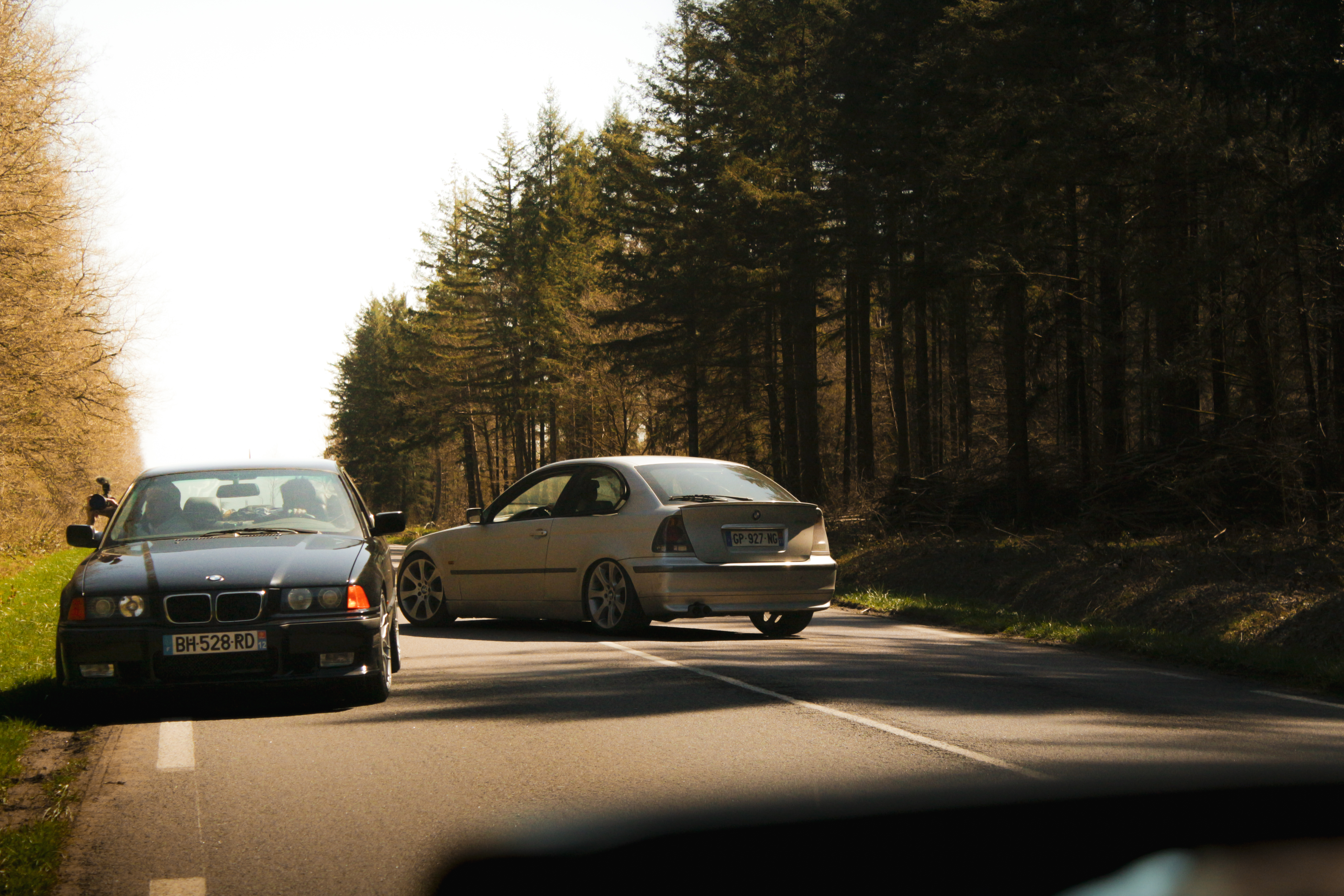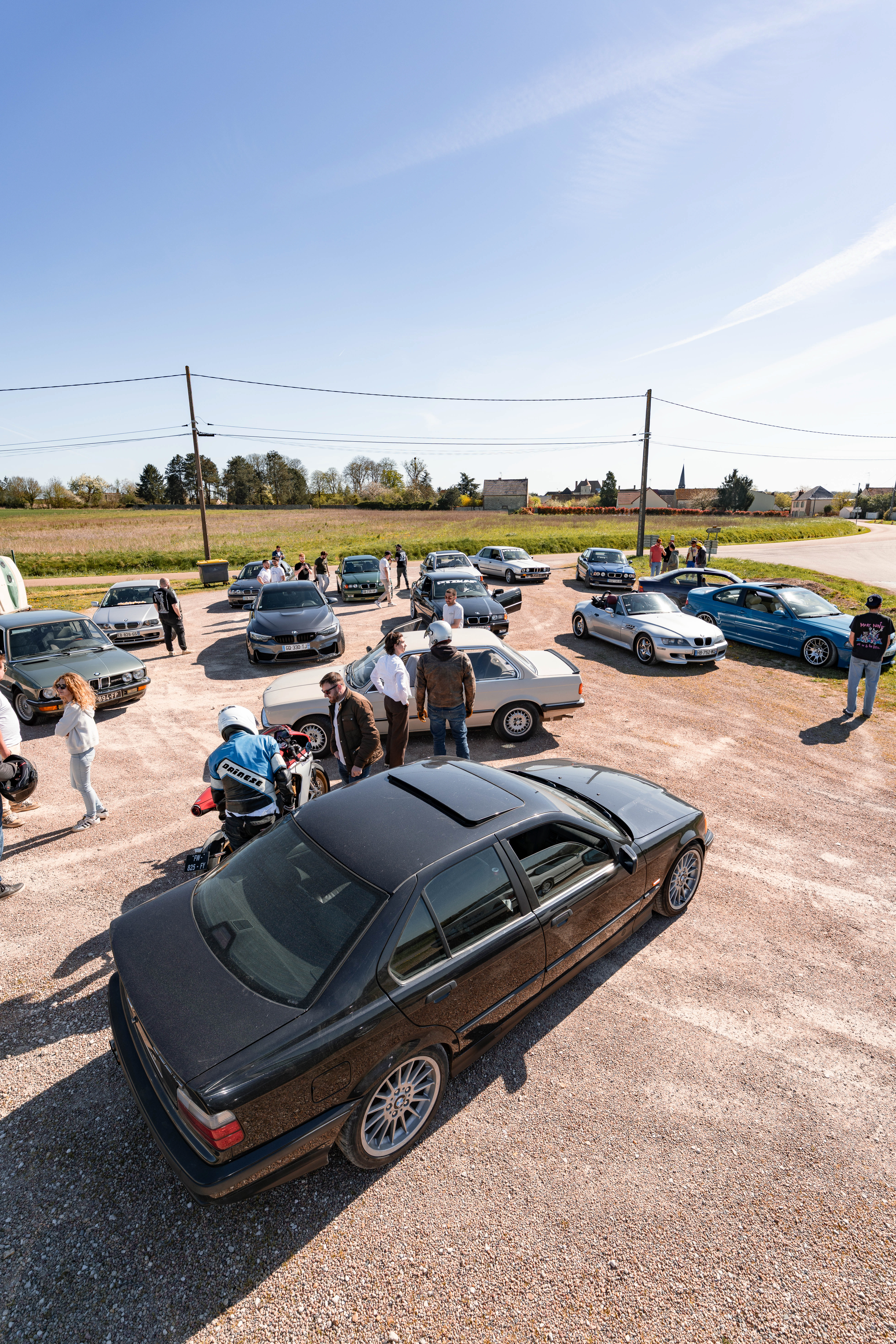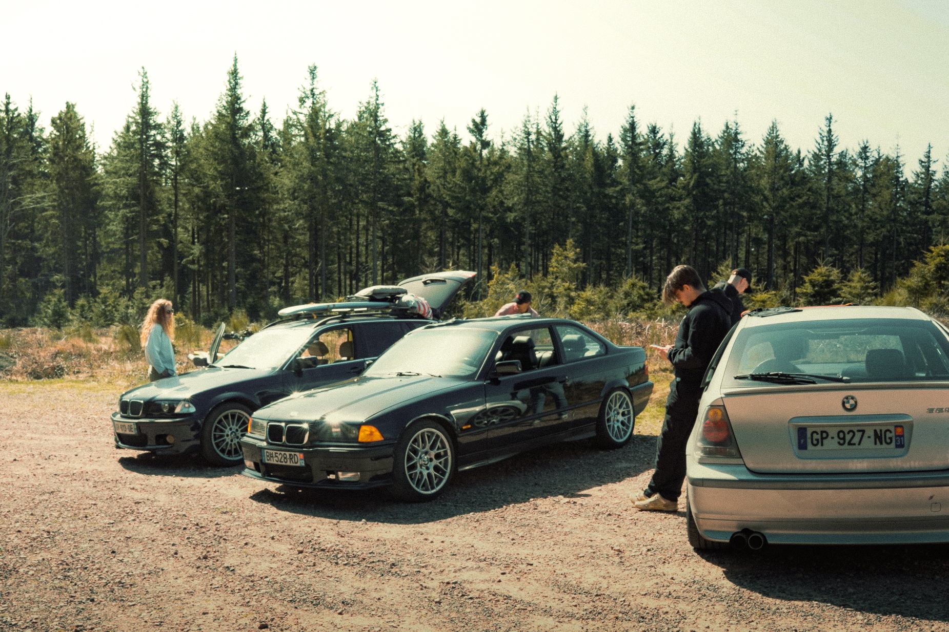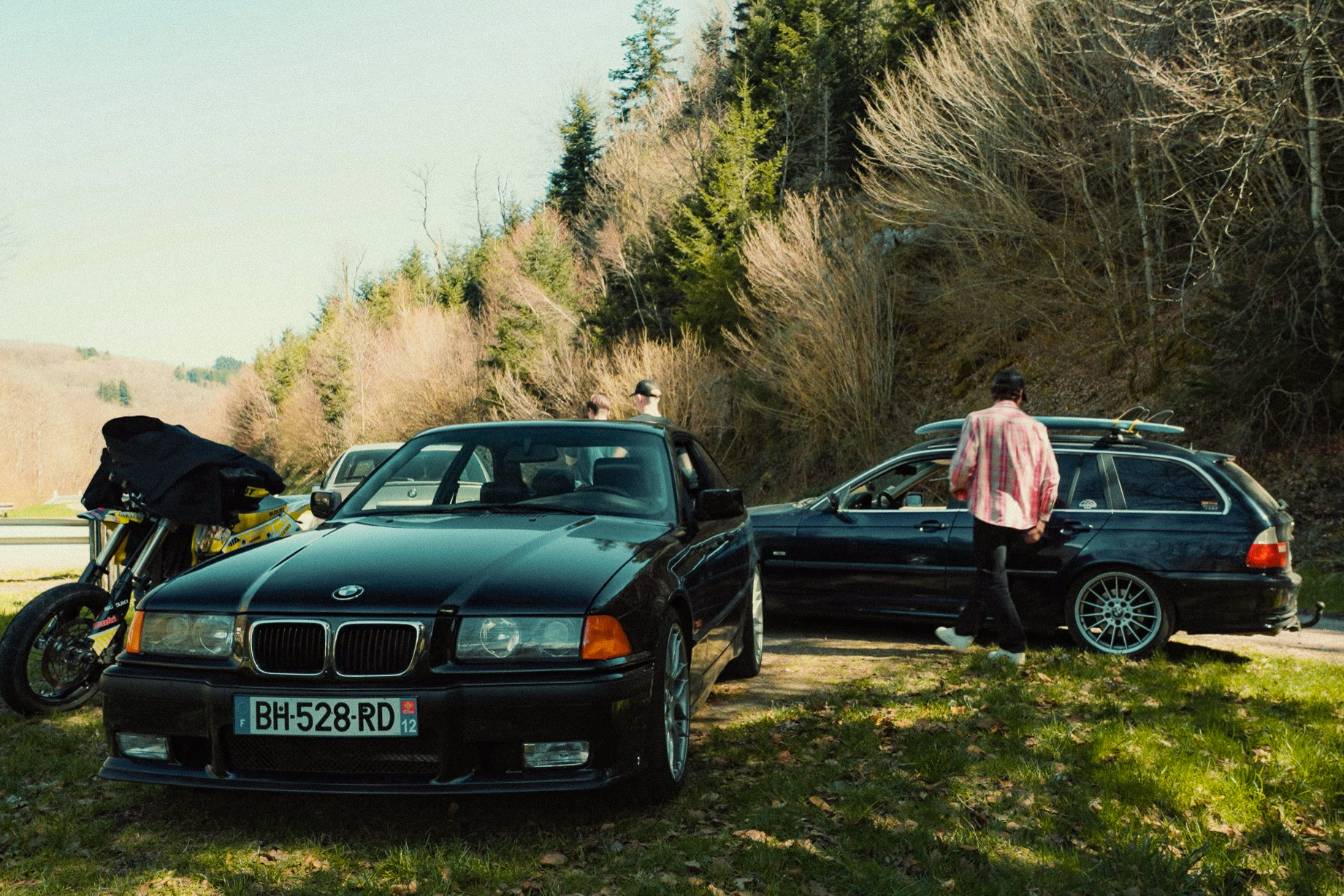 The sun’s out, windows down, elbows out—heading toward the Morvan. We catch up, fashionably late by the traditional courtesy hour, with our usual gang: Pierrot and Momo in their E36 328i and E46 325ti; this trip’s special guests, Antoine, along to grab some shots from the E36; Jerem’ on his 400DRZ, ready to play guide for the weekend; and Johana with me in the Touring, tagging along for a crash course in BMW lingo