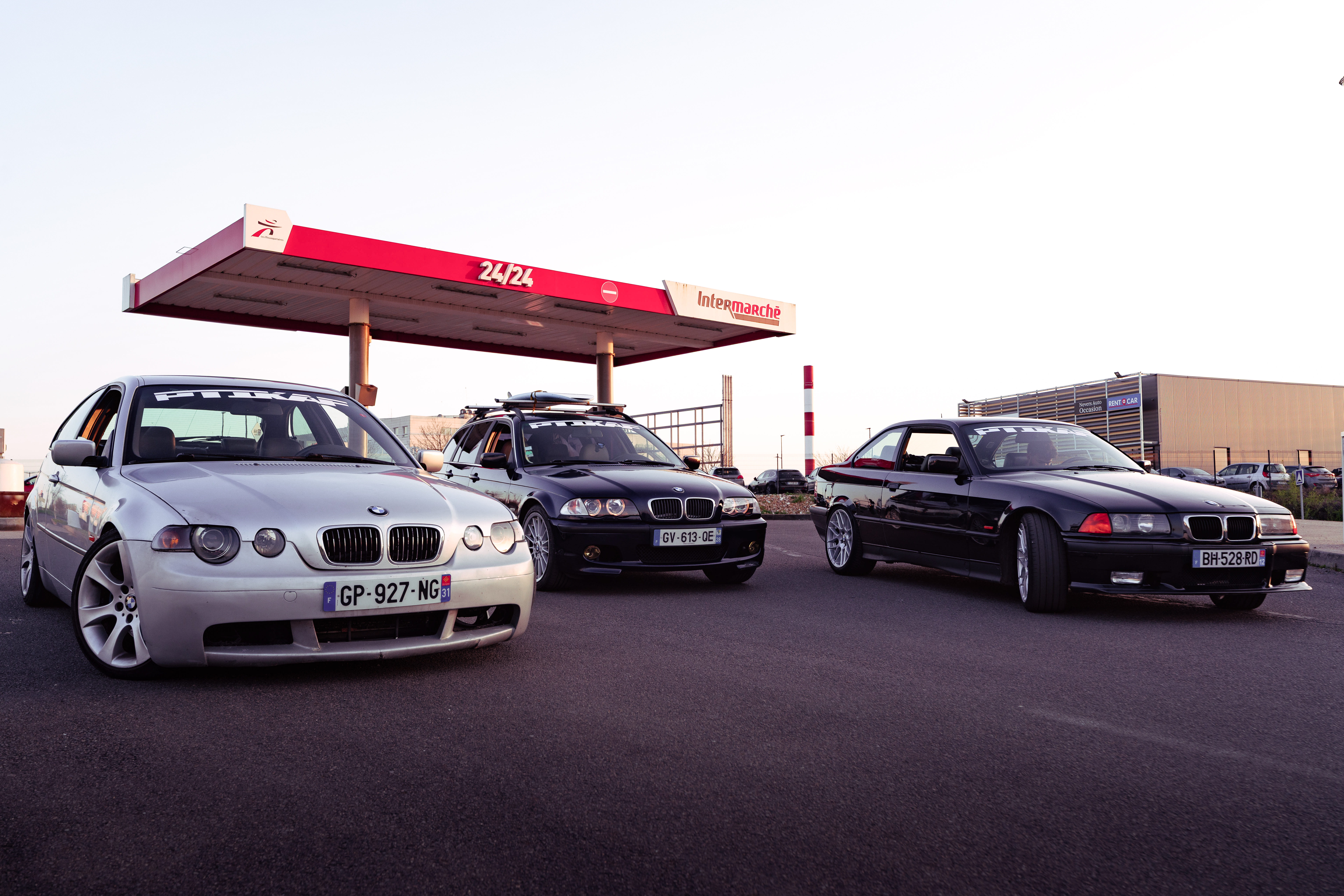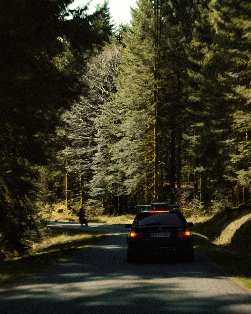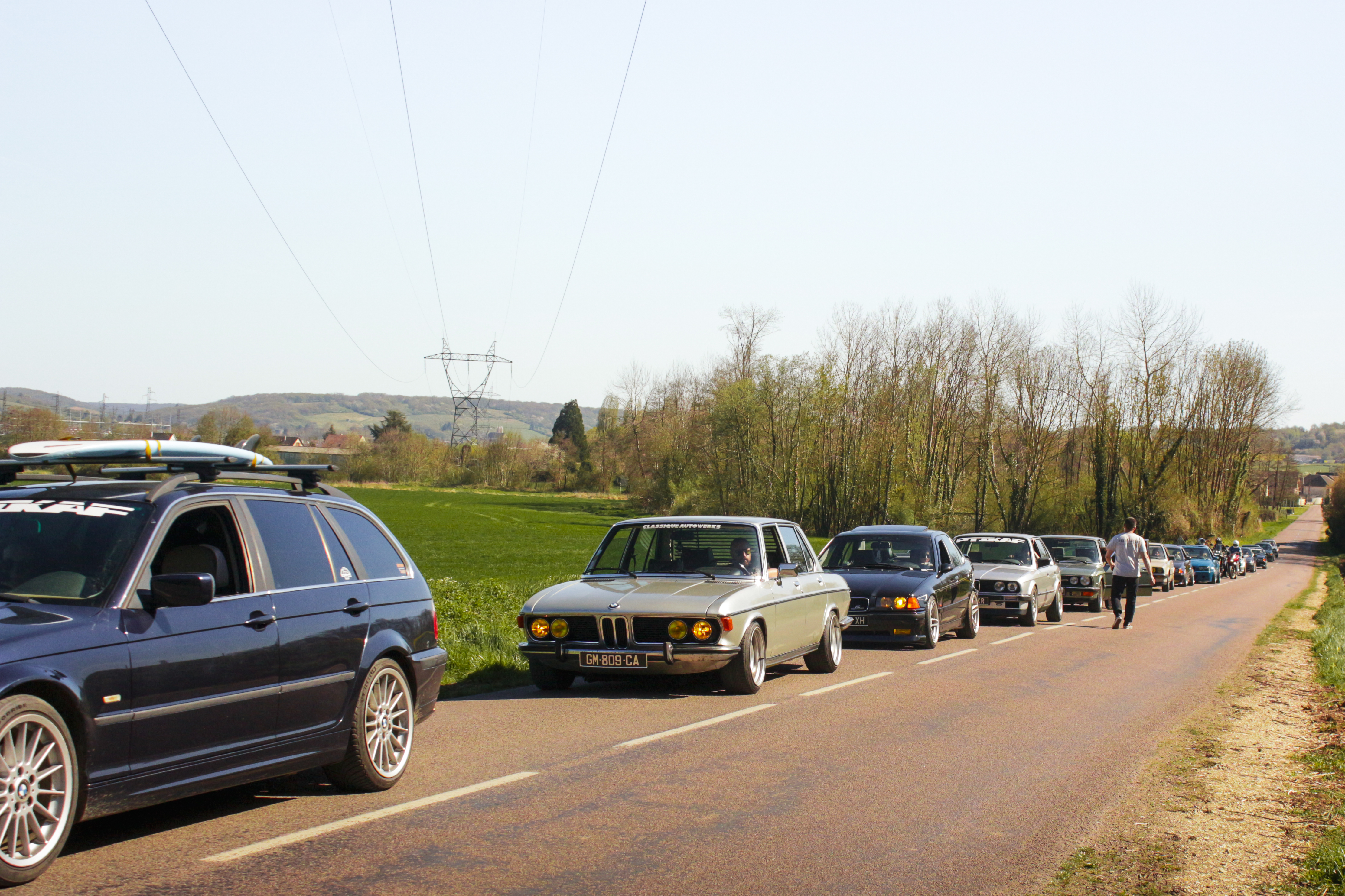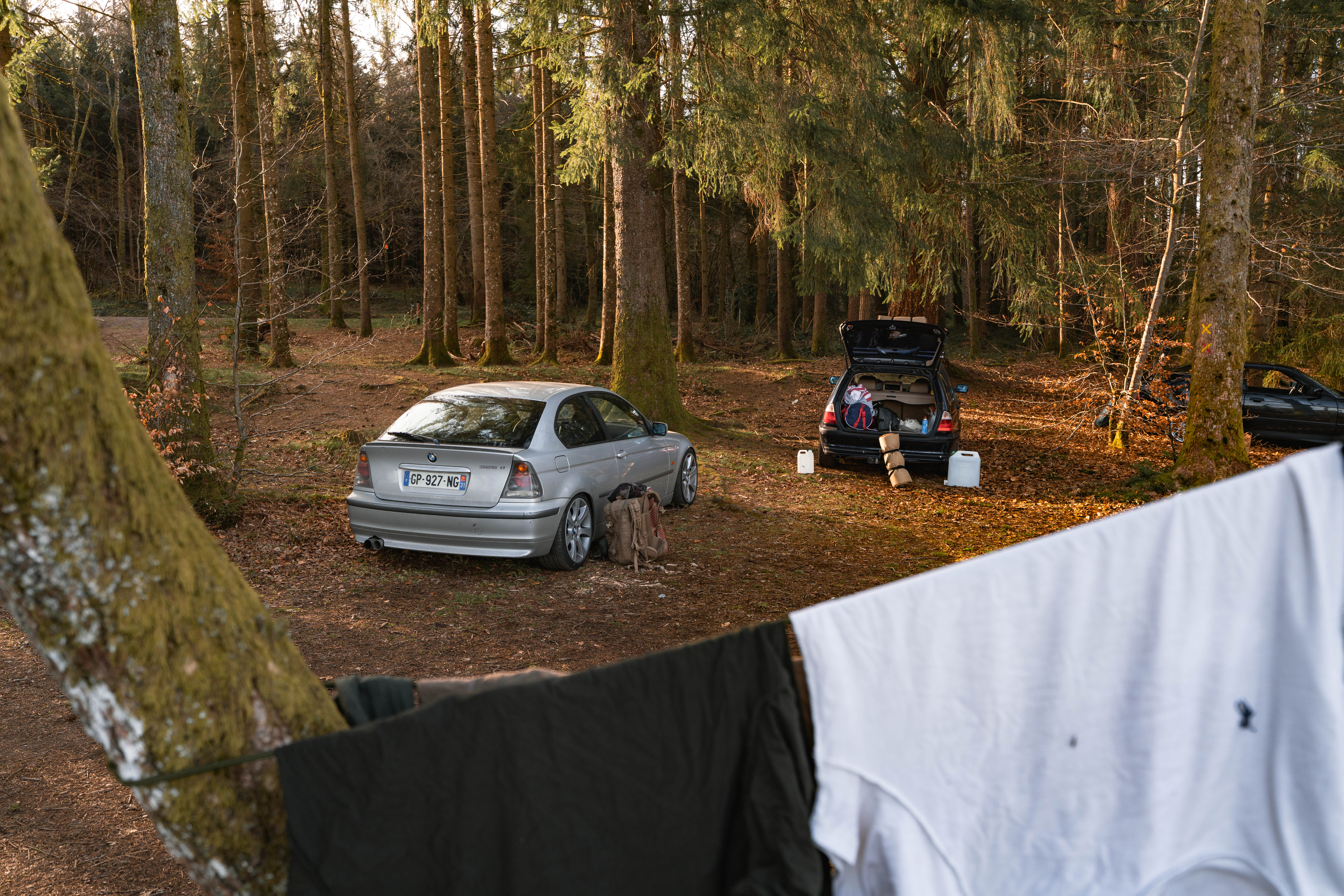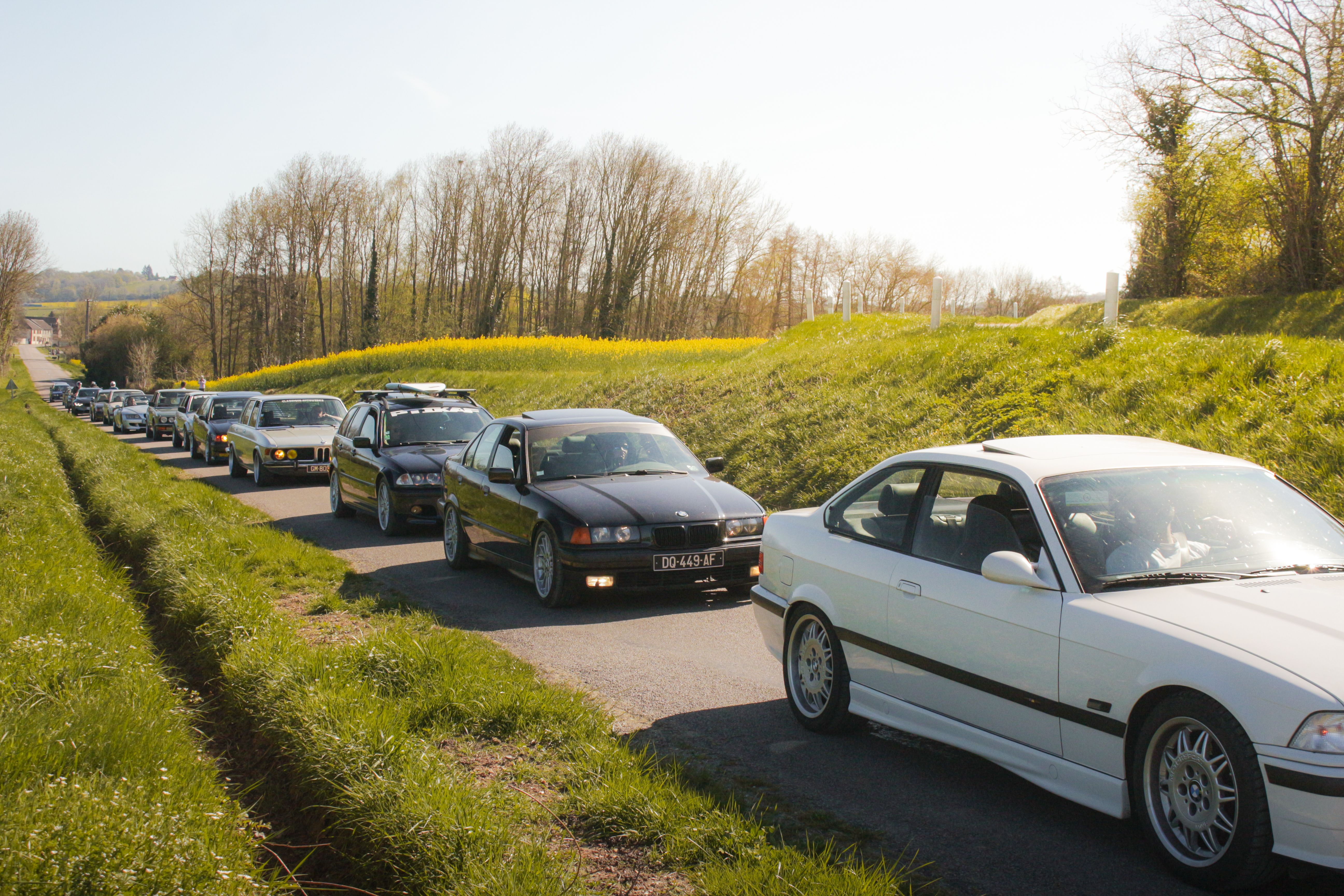 The sun’s out, windows down, elbows out—heading toward the Morvan. We catch up, fashionably late by the traditional courtesy hour, with our usual gang: Pierrot and Momo in their E36 328i and E46 325ti; this trip’s special guests, Antoine, along to grab some shots from the E36; Jerem’ on his 400DRZ, ready to play guide for the weekend; and Johana with me in the Touring, tagging along for a crash course in BMW lingo