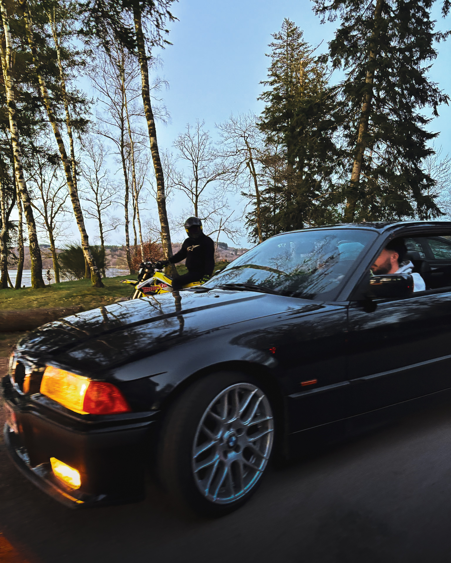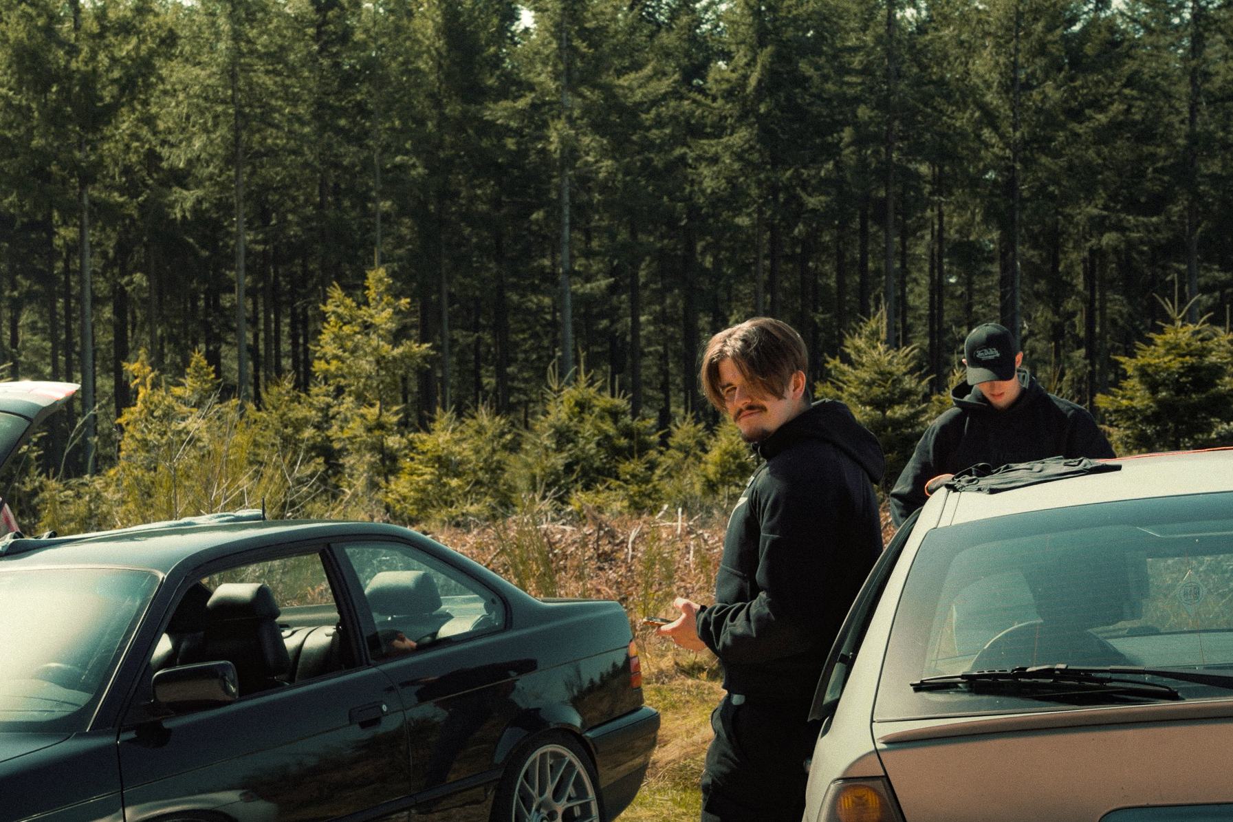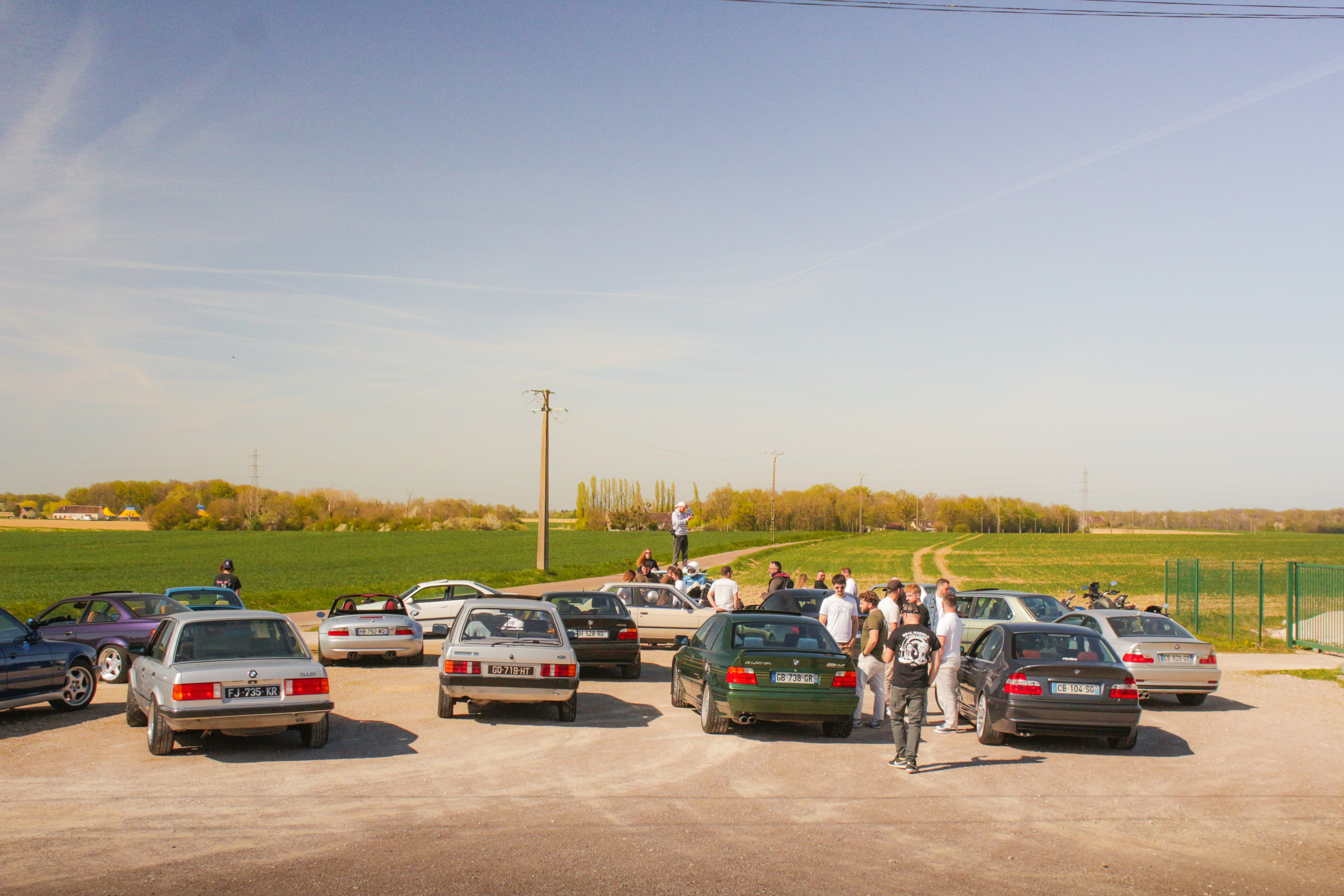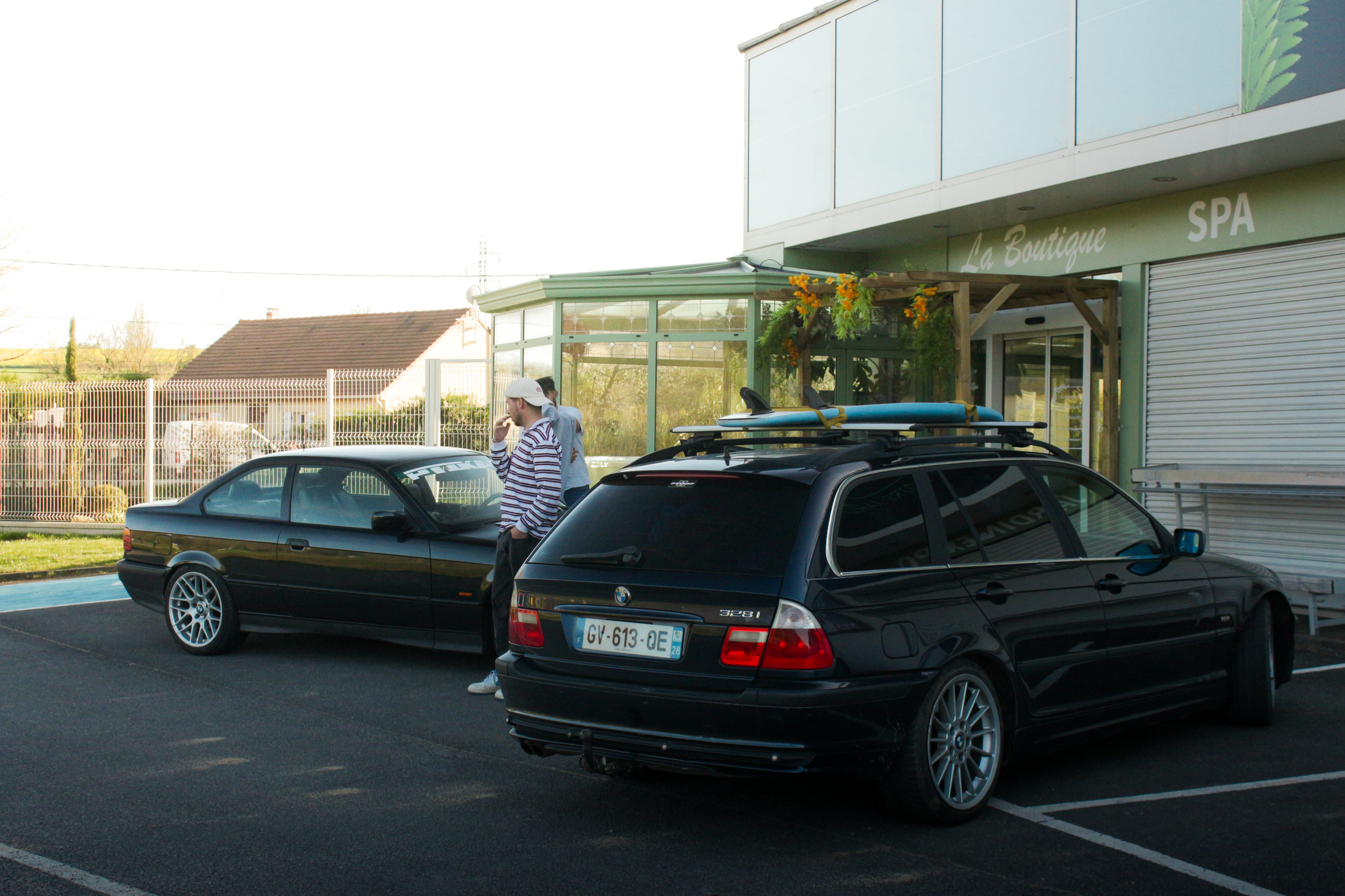 The sun’s out, windows down, elbows out—heading toward the Morvan. We catch up, fashionably late by the traditional courtesy hour, with our usual gang: Pierrot and Momo in their E36 328i and E46 325ti; this trip’s special guests, Antoine, along to grab some shots from the E36; Jerem’ on his 400DRZ, ready to play guide for the weekend; and Johana with me in the Touring, tagging along for a crash course in BMW lingo