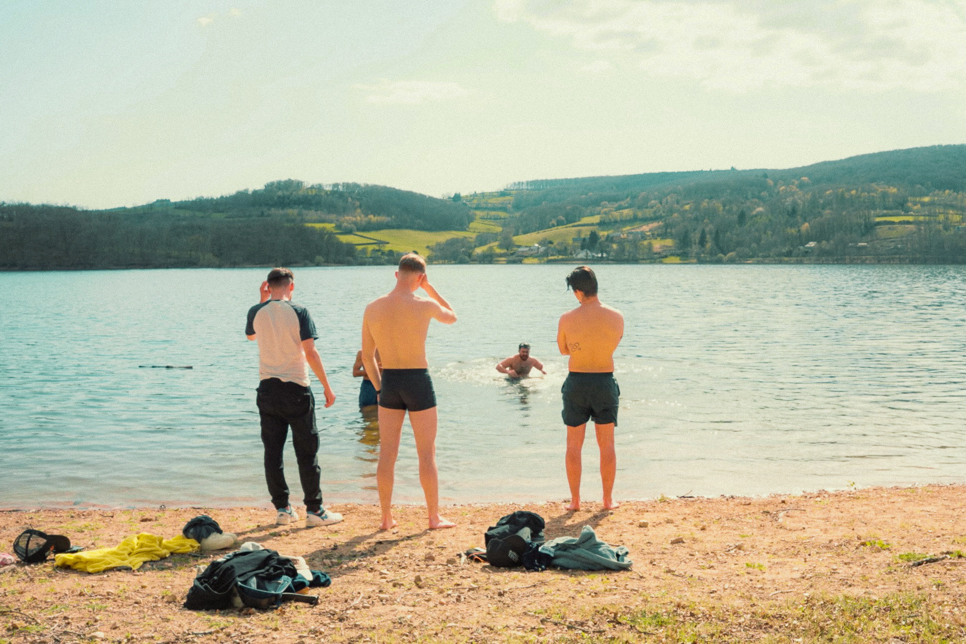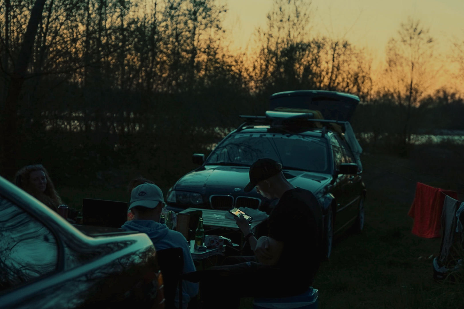 On se cale au bord du lac, quelques virages plus loin, et comme toujours, c’est un joyeux bazar. Pierrot a oublié la grille pour le barbecue, le spot LED toujours déchargé depuis le retour du South Ouest Trip, Jerem’ n’a ni matelas ni sac de couchage… Heureusement on a gardé les bons réflexes : la bière est au frais depuis Auxerre. Allez, santé les copains.