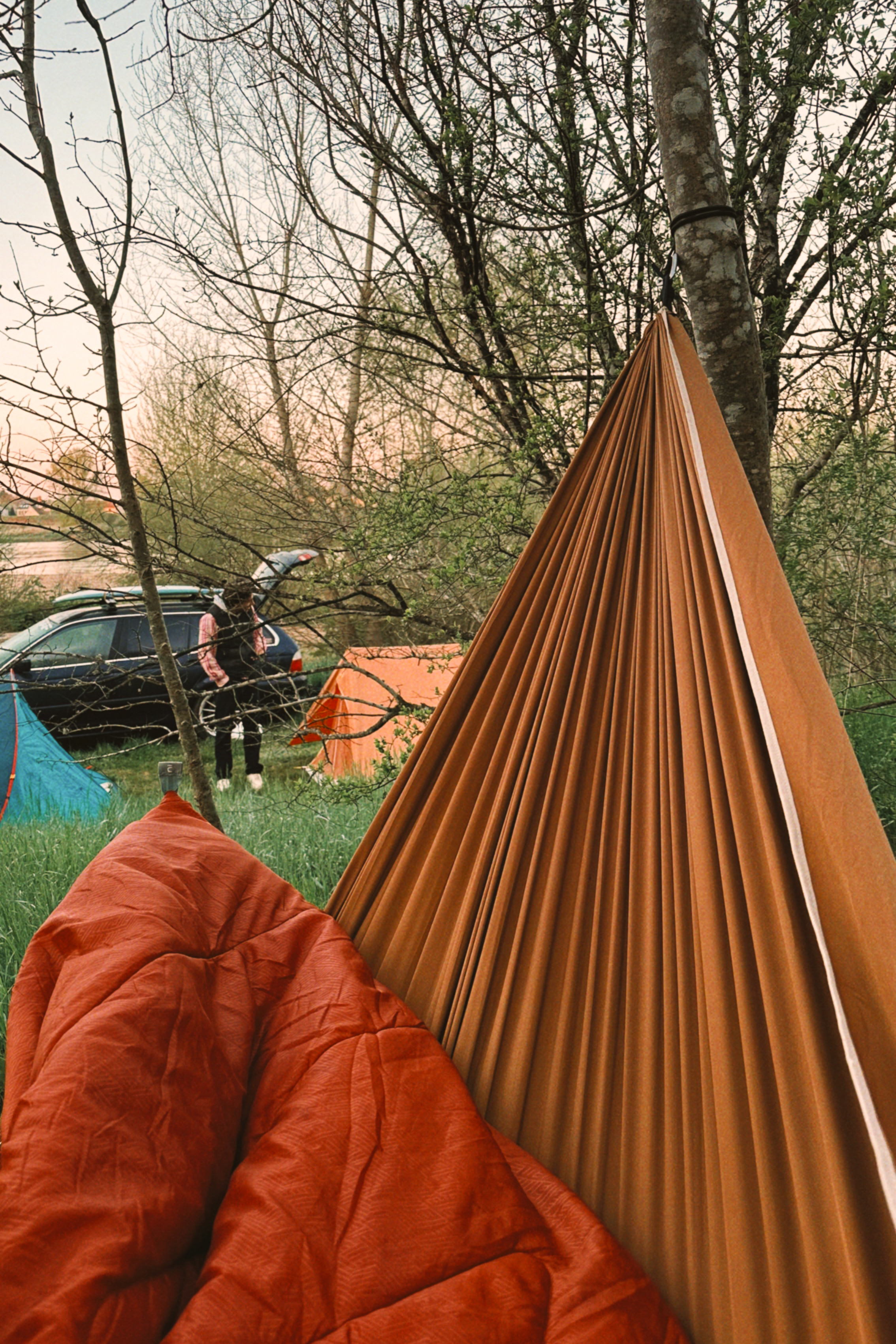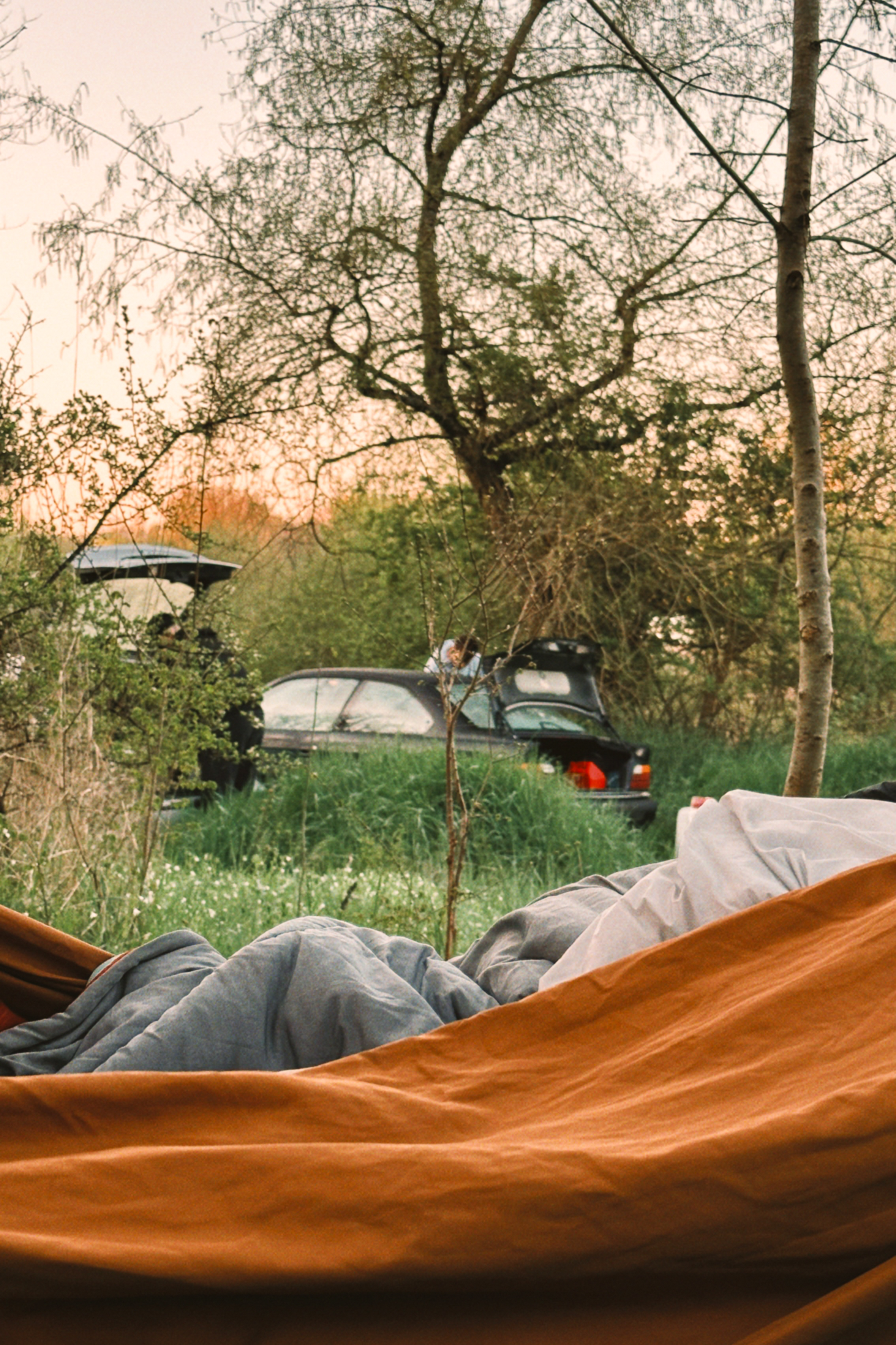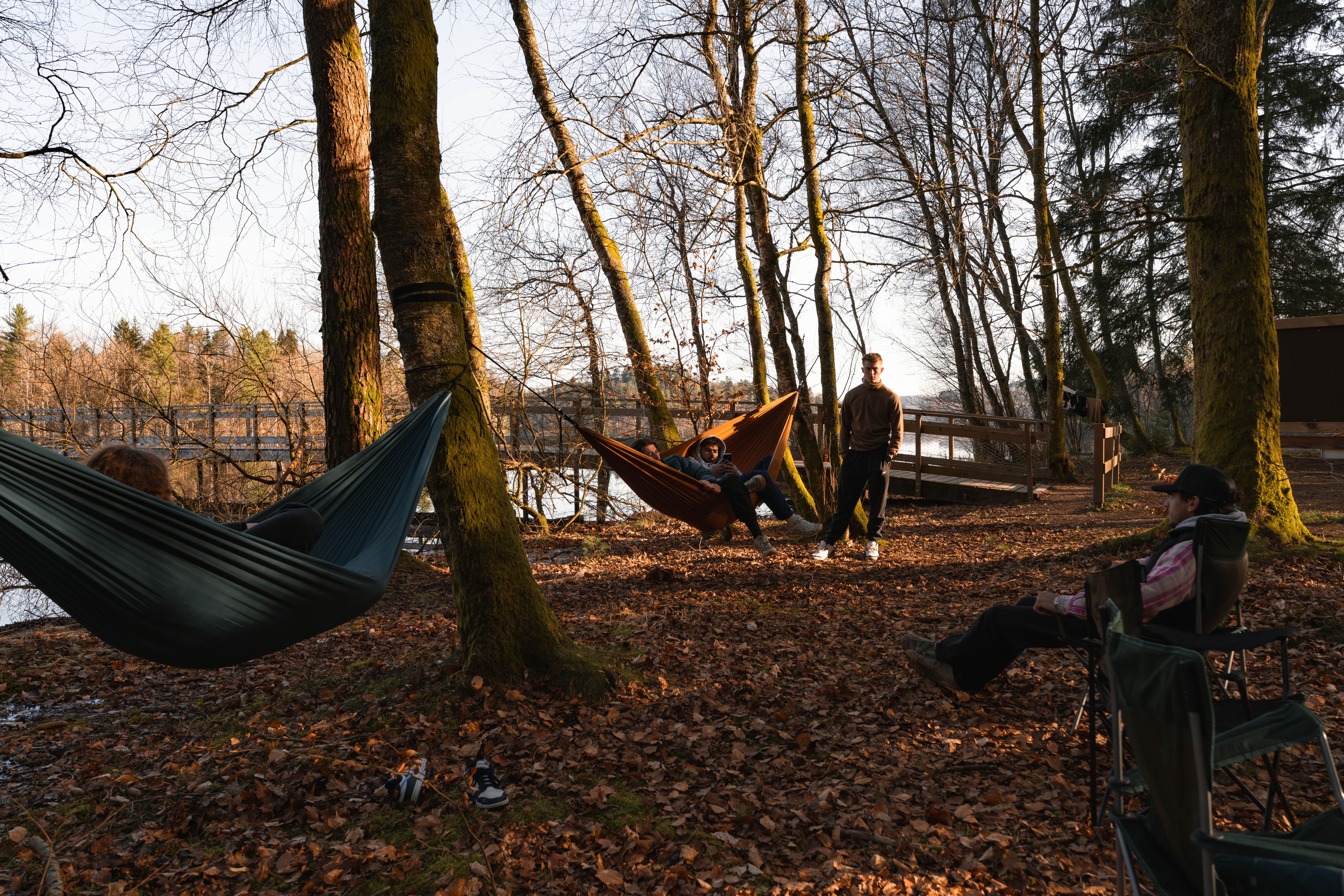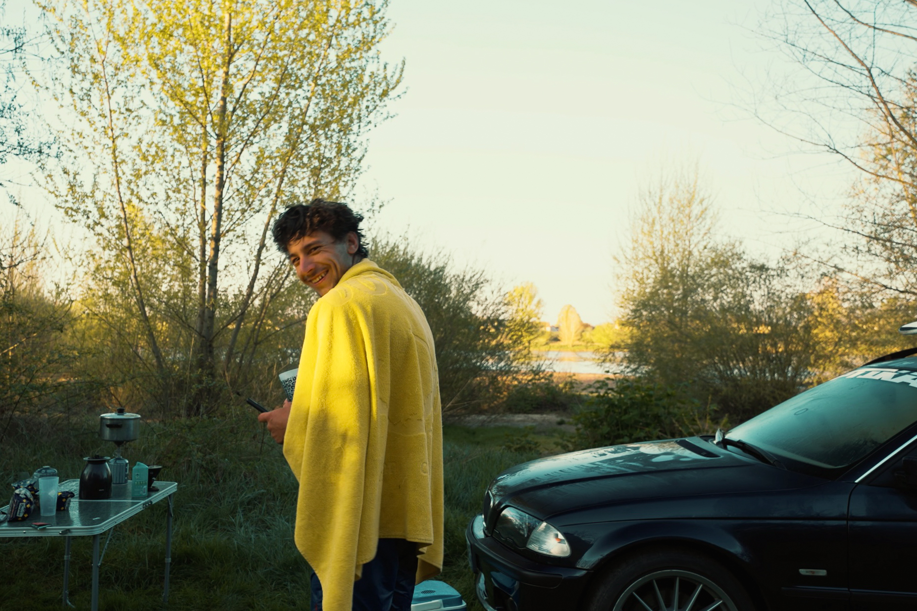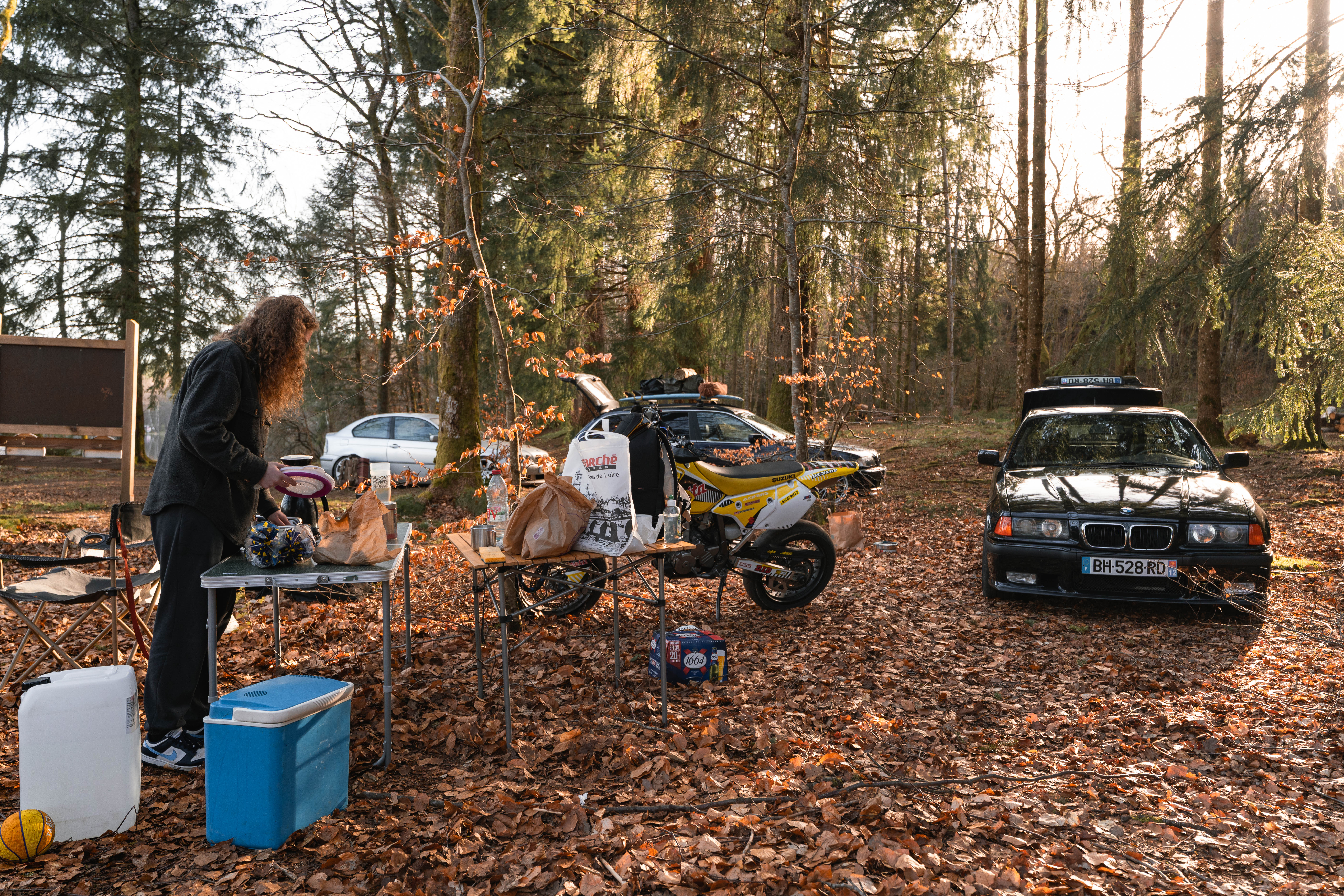 We set the camp by the lake, just a few turns away—and as always, it’s a joyful mess. Pierrot forgot the grill for the barbecue, the LED light battery is still dead from the last South Ouest Trip, and Jerem’ showed up with neither a mattress nor a sleeping bag… Thankfully, we kept our priorities straight: the beers have been chilling in the cooler since Auxerre. Salud, amigos!