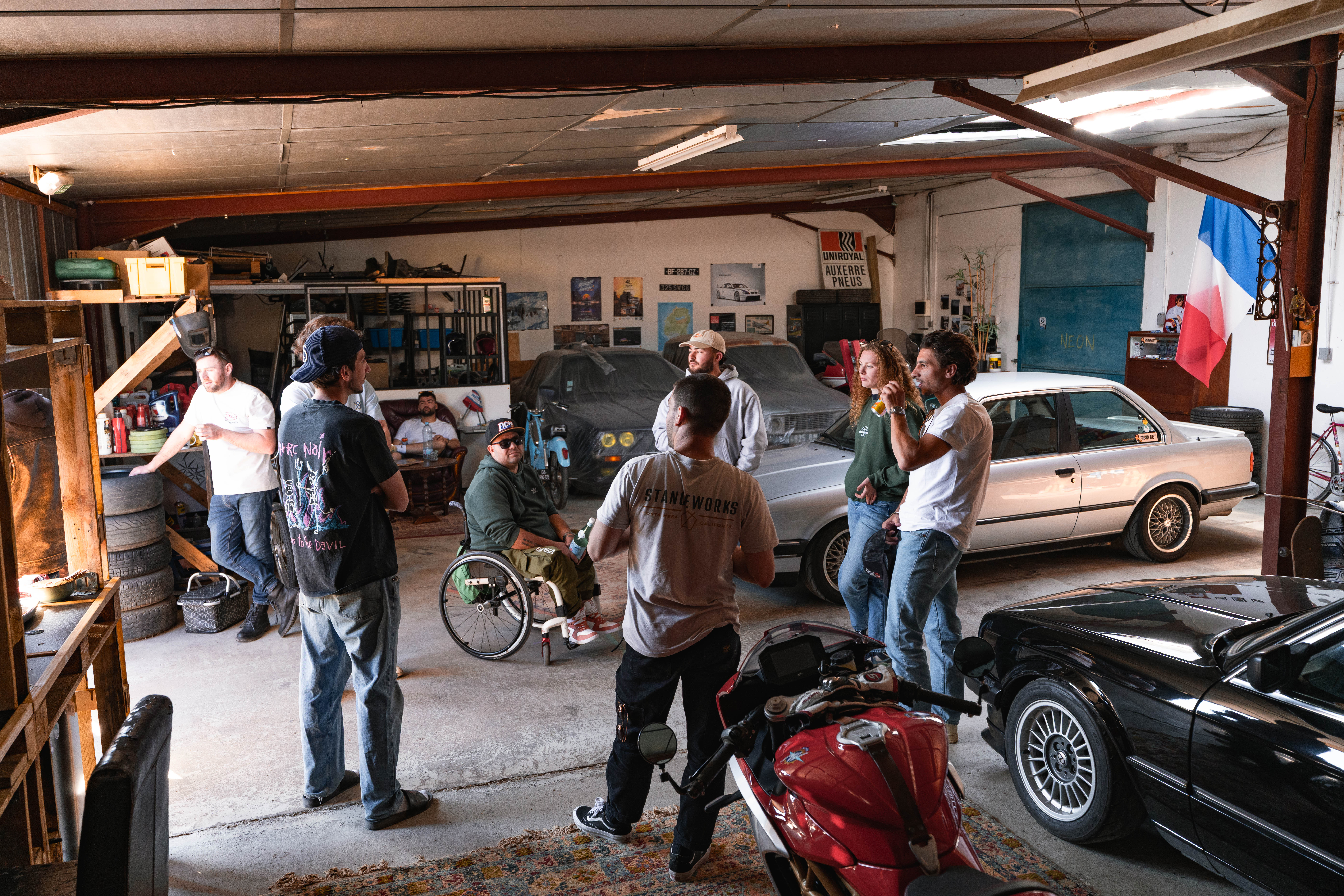 Inside Armand’s workshop, the smell of hot coffee mixes with the passion for the brand with three letters. Half of Burgundy’s E30s must have stayed here at once, shedding a gear knob, a hubcap, or a piece of bodywork along the way to decorate the walls. A place that could’ve fueled the dreams of my younger self, who played with toy cars and built garages out of Kapla blocks on the carpet.